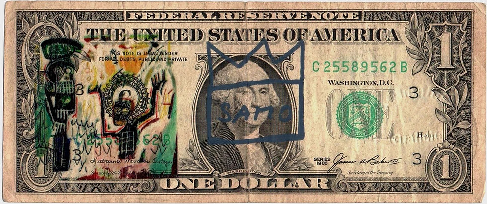 Ces œuvres, sur d’authentiques billets de dollars américains, sont issues d’un projet commun initialisé par Andy Warhol avec la participation de ses amis, Keith Haring et Jean Michel Basquiat.